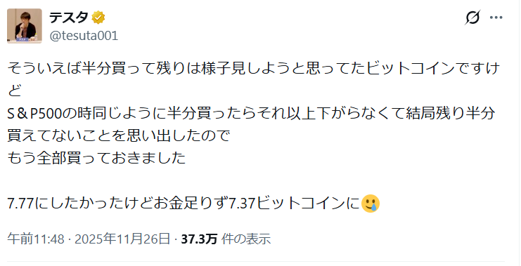 2025年11月22日、日本の著名投資家テスタ氏が、自身のXアカウントにて初めてビットコインを購入したことを公表しました。