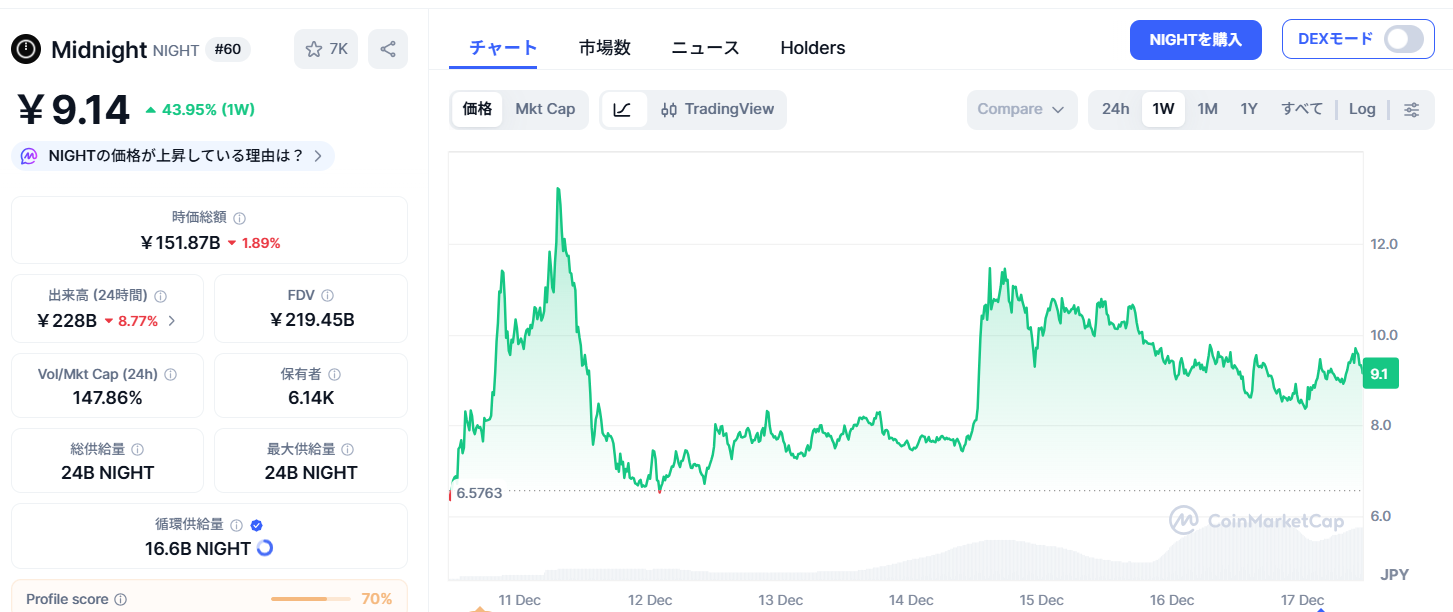 12月9日の時点(「NIGHTトークン上場後相場|最新価格と市場トレンドをチェック」)では206位でしたので、約1週間で驚異の上昇率です。